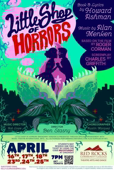 One of the things I'm most grateful for during my time at Red Rocks is that the theater department trusted me with their show posters. I designed six over the course of my studies, the four I'm proudest of are here. Some of them, like Cabaret and Little Shop of Horrors, I came to the project with a premeditated adoration for the show. Others, like The Sins of Sor Juana, I'd never encountered before, and the research process of getting to know a show from before designing for it turned out to be one of my favorite processes.